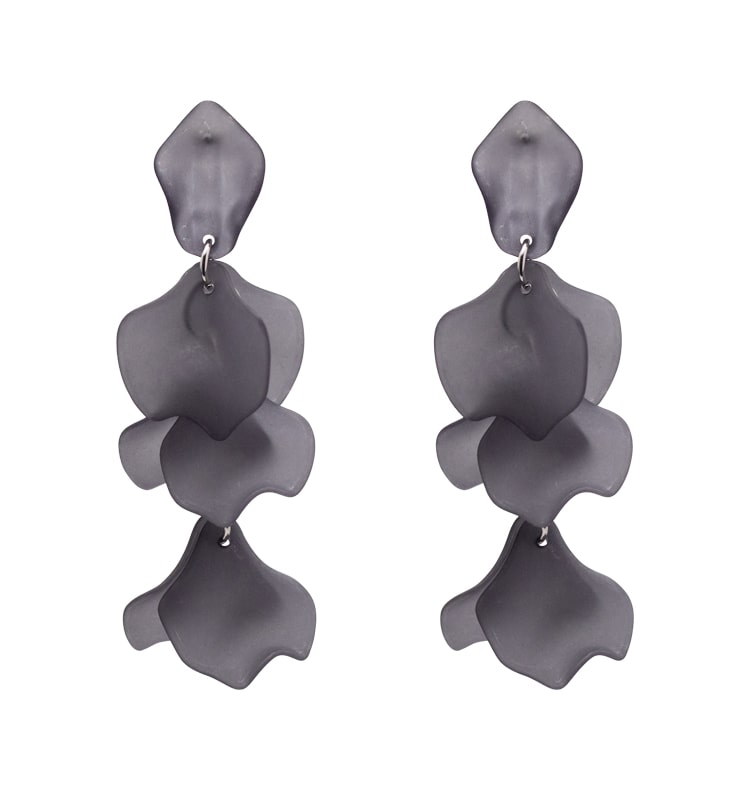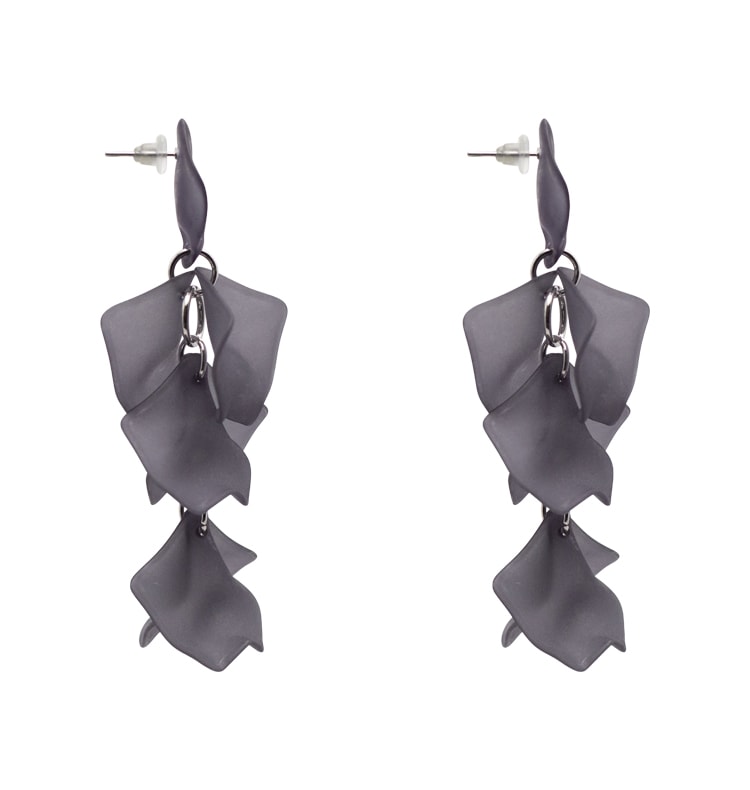 Zena är de perfekta statementörhängena! Örhängena består av svarta blomblad i akryl som fästs med ringar i rostfritt stål, och faller vackert från örat. Kommer i tre färger: svart, grön och beige.