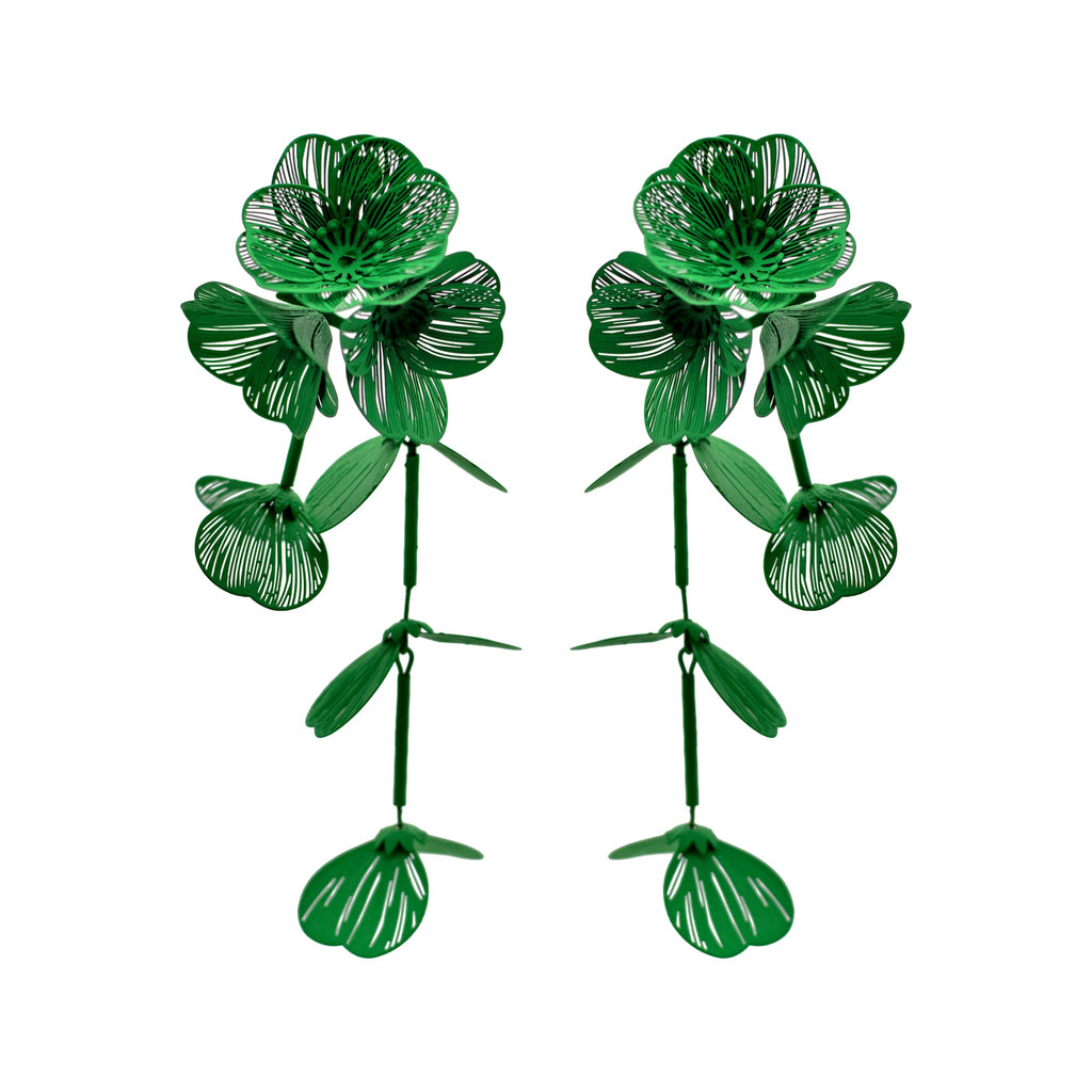 Jessica är dina nya statementörhängen som lyfter varje outfit! Örhänget består av tre skira blommor i lätt metall, som tillsammans formar en elegant och luftig siluett. Under blommorna hänger länkade smala pinnar – den ena prydd med tre utspridda blad, den andra kortare och med ett enda blad. Örhängena är lätta att bära men tar plats på det där perfekta sättet. Örhänget Jessica kommer i tre färger: Svart, röd och grön.