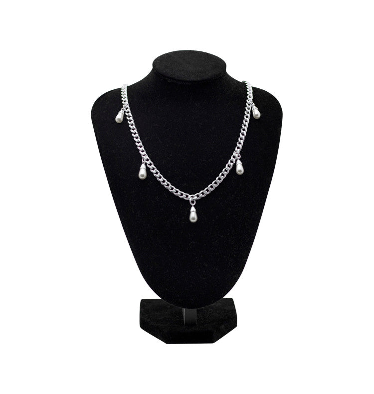 Möt Lucy necklace! Ett vackert kedjehalsband prytt med 5 stycken pärlberlocker. Kedjan är en platt pansarlänk och berlockerna är i plastpärlor. Halsbandet är tillverkad av silverpläterat rostfritt stål.