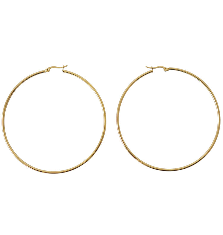 Ett par stilrena och trendiga hoops i guldpläterat rostfritt stål. Med sin klassiska design och en diameter på 75 mm är dessa hoops perfekt till både vardag och fest. Örhängena är nickeltestade