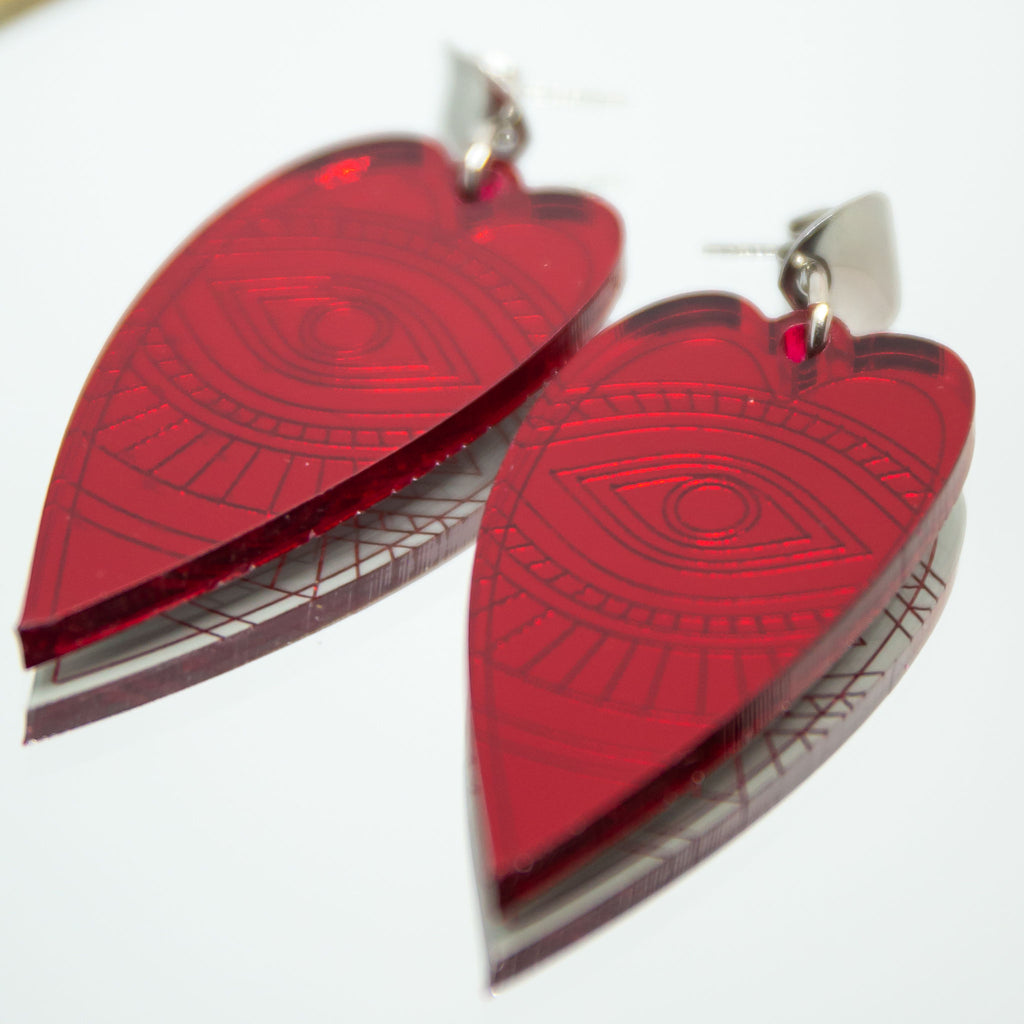 These statement earrings combine an iconic heart shape with an engraved eye in transparent red material – a design that balances romance and mystery. The transparent red shifts beautifully in the light and gives a powerful expression.