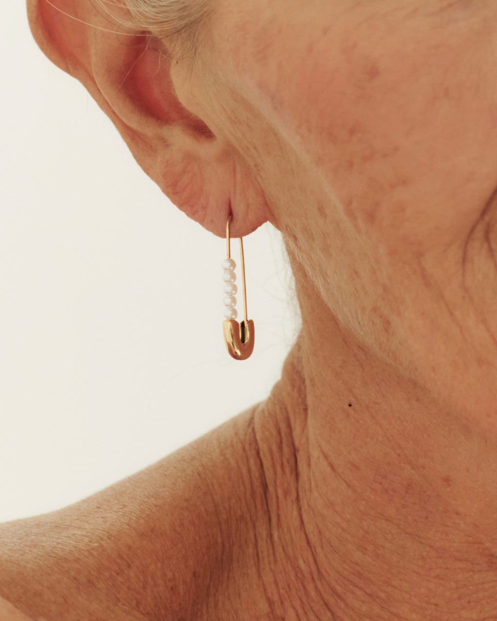 Ett tufft men samtidigt vackert örhänge i form av en säkerhetsnål. På stiftet är fem små vita pärlor trädda, vilket skapar en unik balans mellan edge och elegans. Örhänget sätts på genom att öppna det som en vanlig säkerhetsnål och trä stiftet genom hålet i örat.