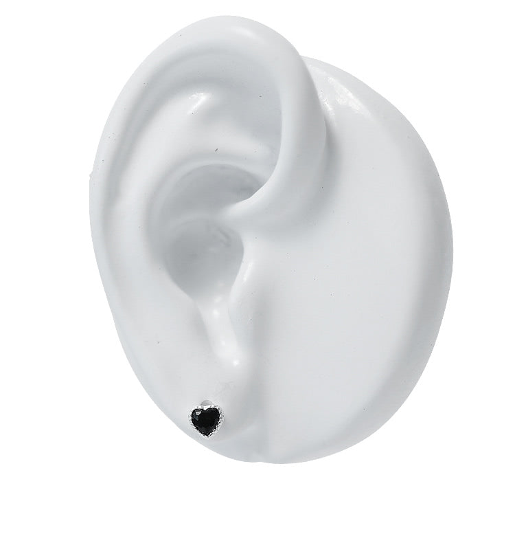 A sleek stud earring in 925 sterling silver, shaped like a small heart and adorned with an elegant black stone. This earring adds a subtle touch of elegance while giving your look a hint of edge. The earring is sold individually and is perfect for wearing alone or paired with other earrings.