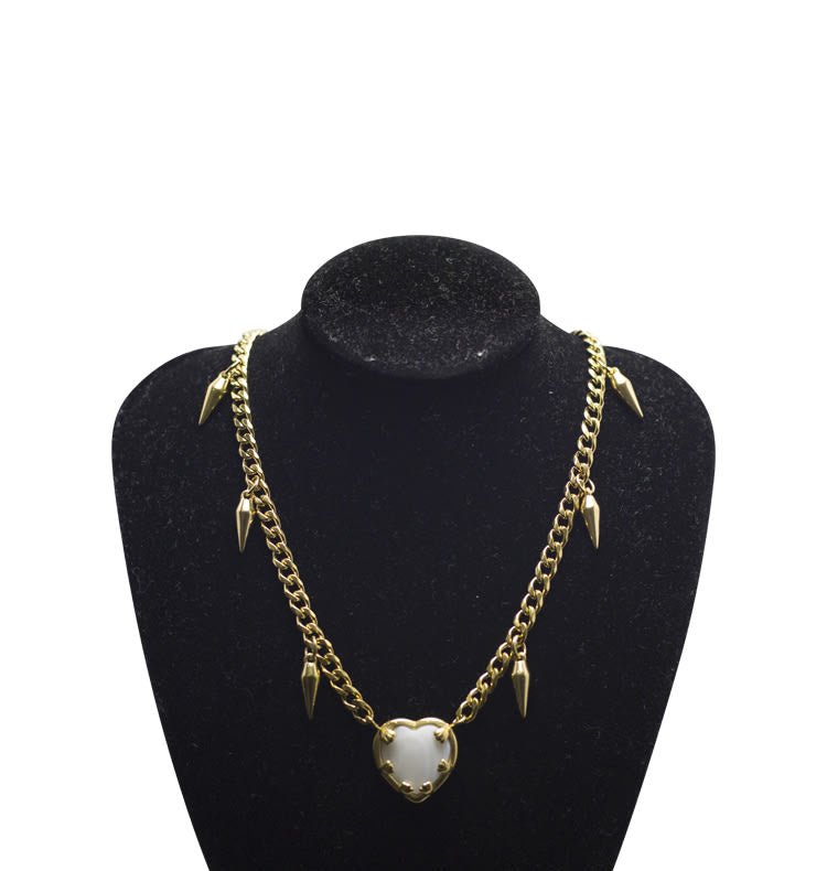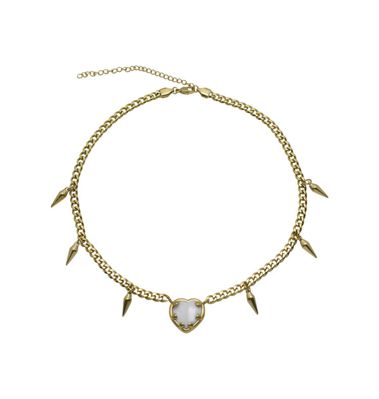 Birgitta är ett vackert kjedjehalsband prytt med nitar och ett vitt pärlhjärta. Kedjan är platt och går att justera mellan 42-50 cm till önskad längd.