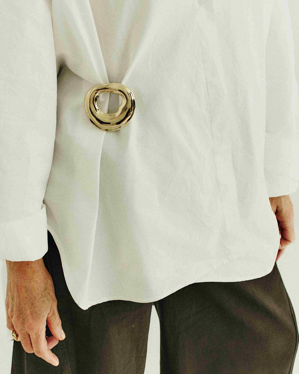 En skulptural brosch med mjuk, rundad och organisk form i högblank guldfinish. Den oregelbundna silhuetten och den öppna mitten skapar ett modernt, konstnärligt uttryck som känns både minimalistiskt och statement på samma gång.