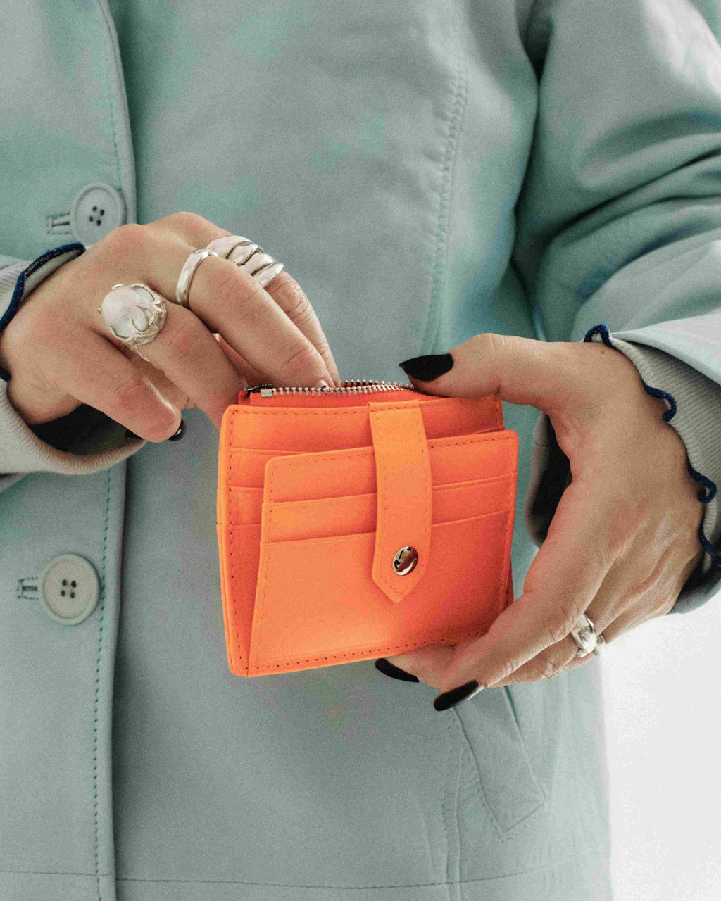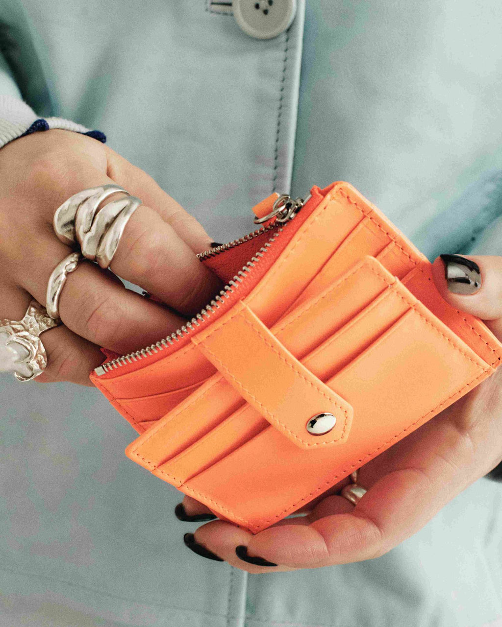 Street sensation neon orange plånbok är en del av vår Upcycling Collection, skapad av överblivet material och skinnrester från tidigare kollektioner. Street sensation är en praktiskt och behändig plånbok i neonorangefärgat lammskinn. Plånboken är utrustad med en silverfärgad dragkedja som försluter ett myntfack och har plats för 8 öppna fack för kreditkort samt ett genomskinligt fack för leg.